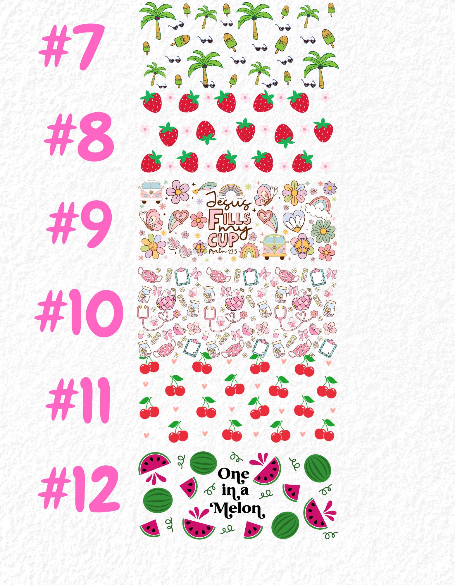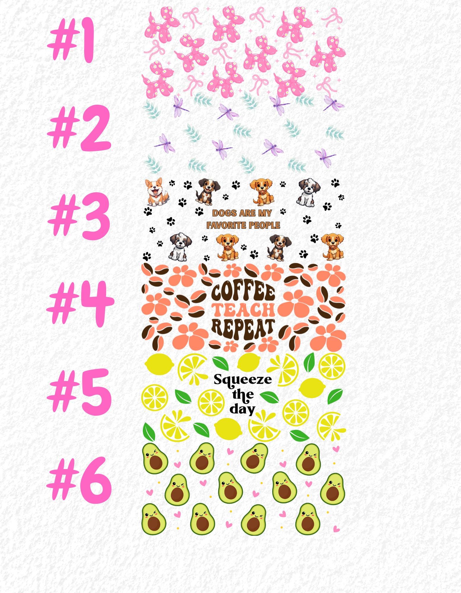 You Pick Which Design And how many: #1 Balloon Pups #2 Dragonflies #3 Dogs Are My Favorite People #4 Coffee Teach Repeat #5 Squeeze The Day #6 Avocados #7 Palm trees & Sunglasses #8 Strawberries W/pink flowers #9 Jesus Fills My Cup #10 Nurse Life #11 Cherries #12 One In A Melon