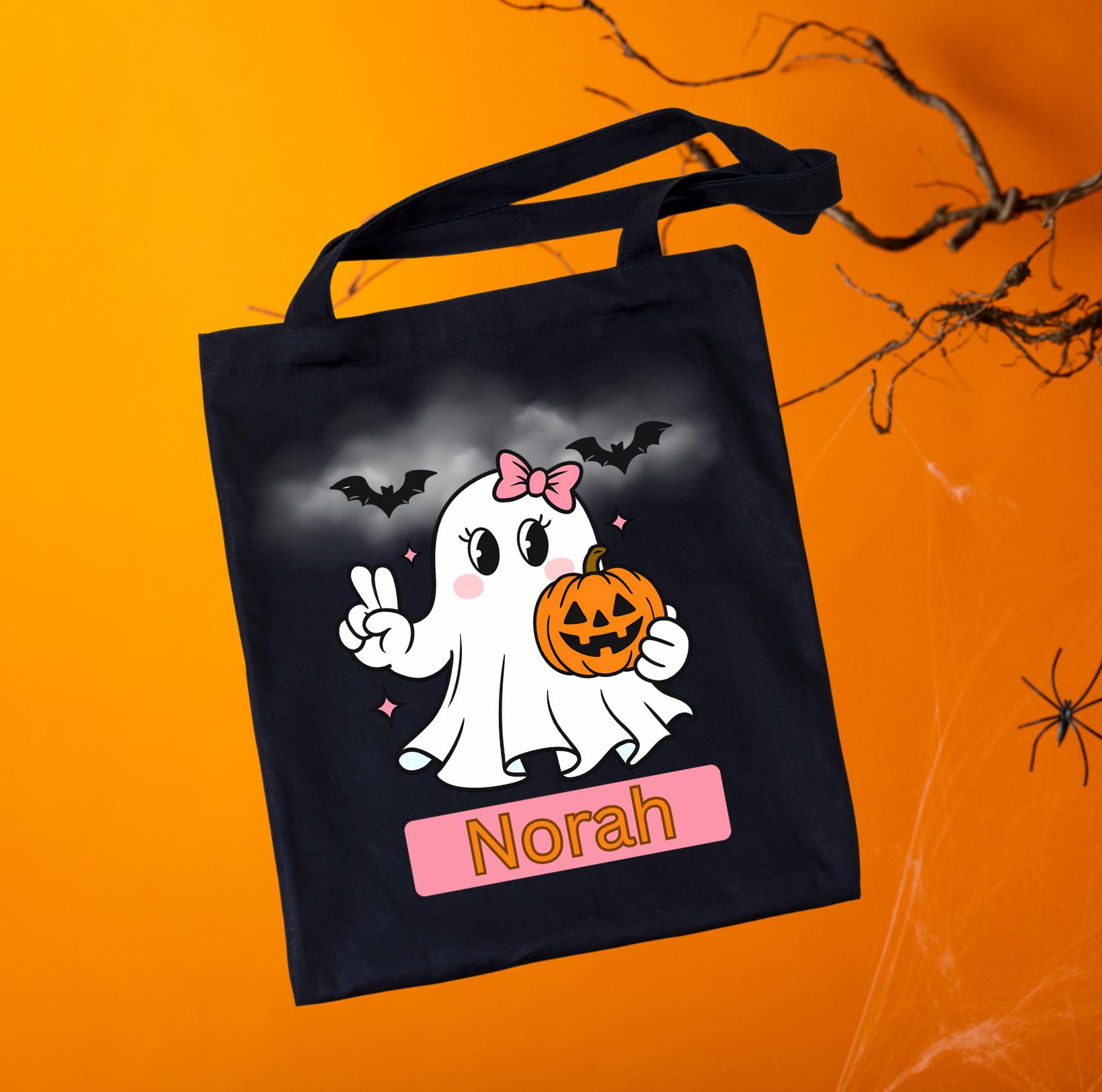 Features: Light weight 6oz canvas tote bag perfect for trick or treating -available in black -size is approx. 14 in x 15 in (plus handle)