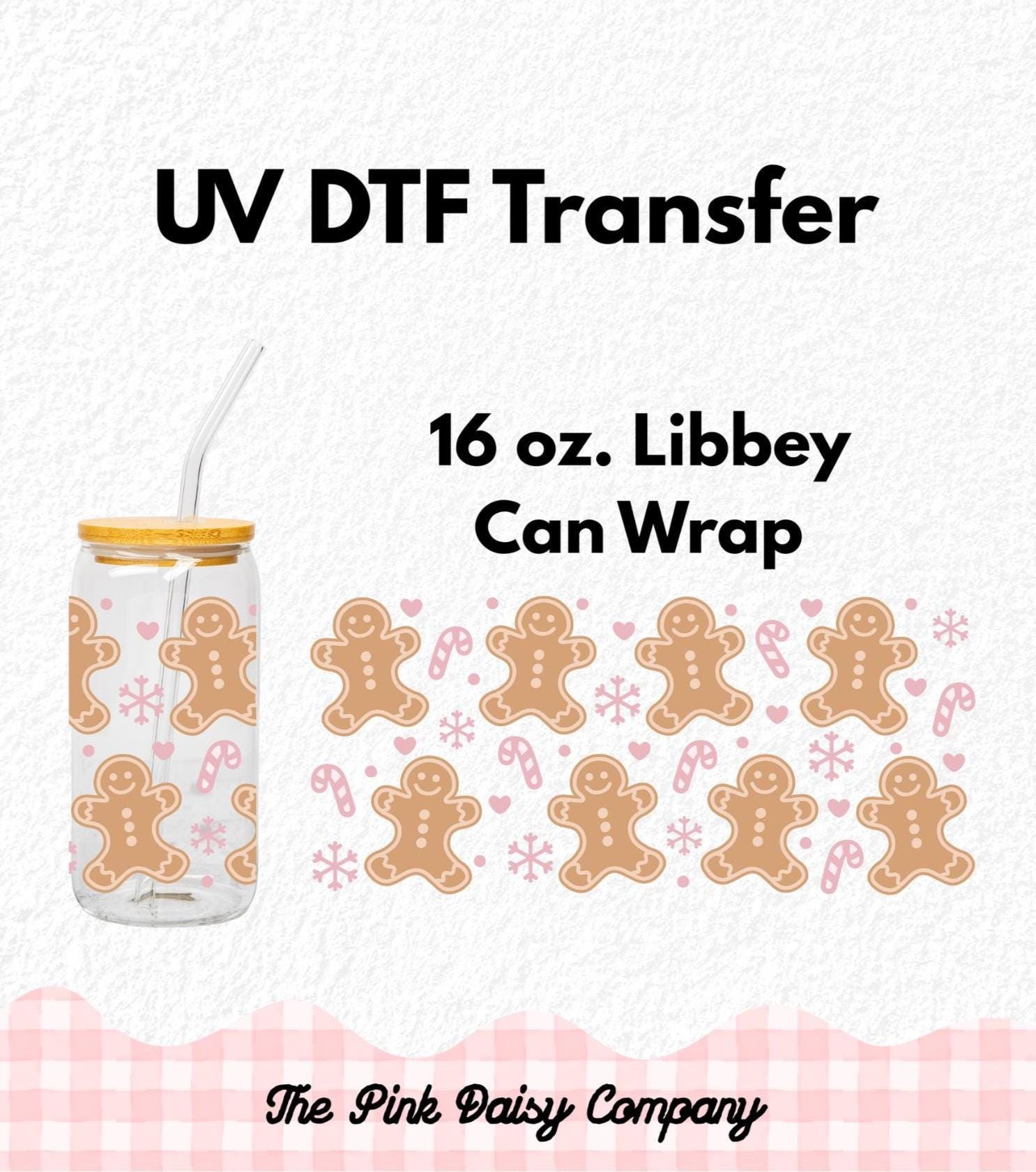 - UVDTF wraps are measured and cut for 16oz Libbey glass cans (measuring 9.5" circumference). **Please note: not all manufacturers glass cans are the same