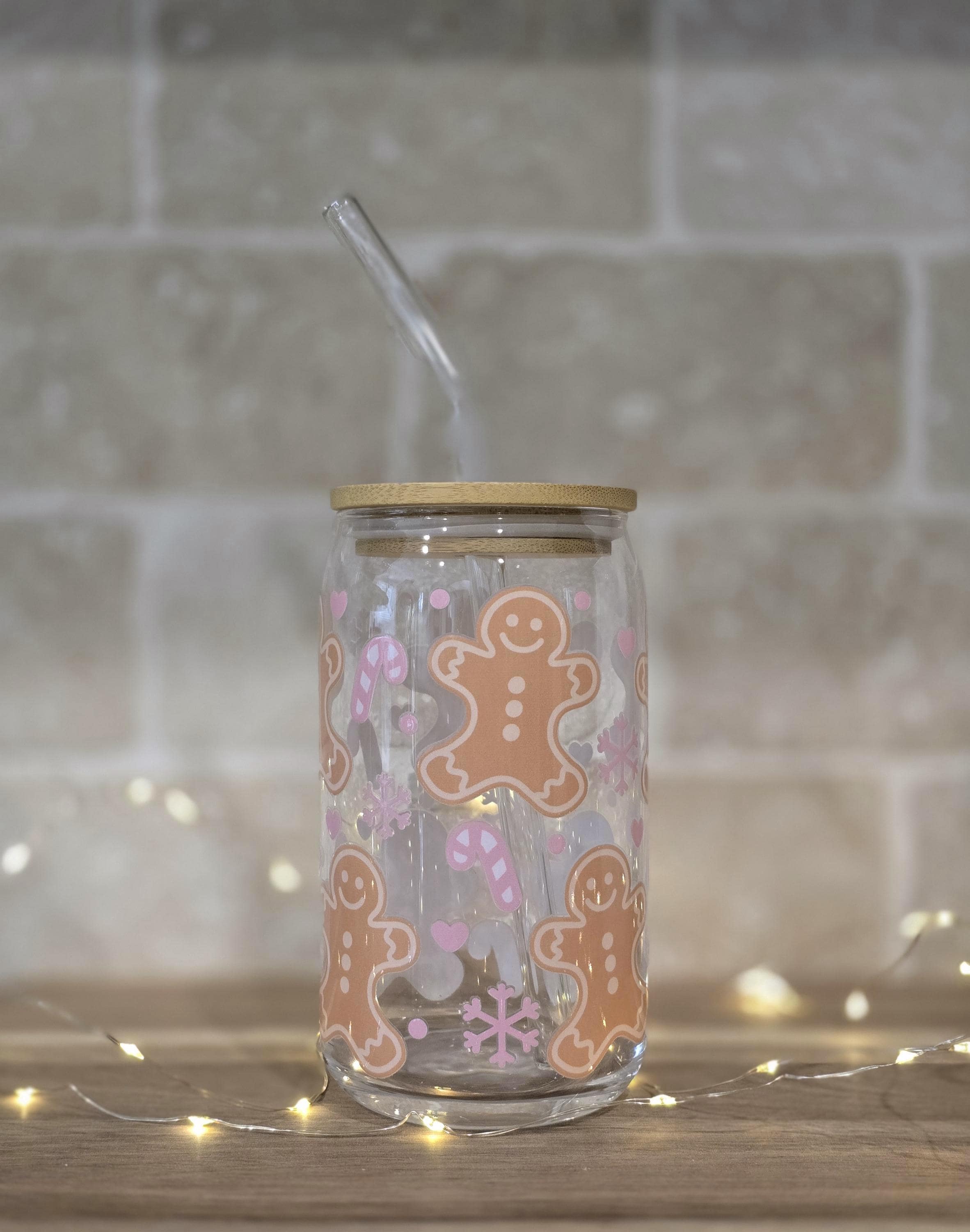 Pink Christmas Gingerbread Man 16 oz Glass Can with bamboo lid and glass straw