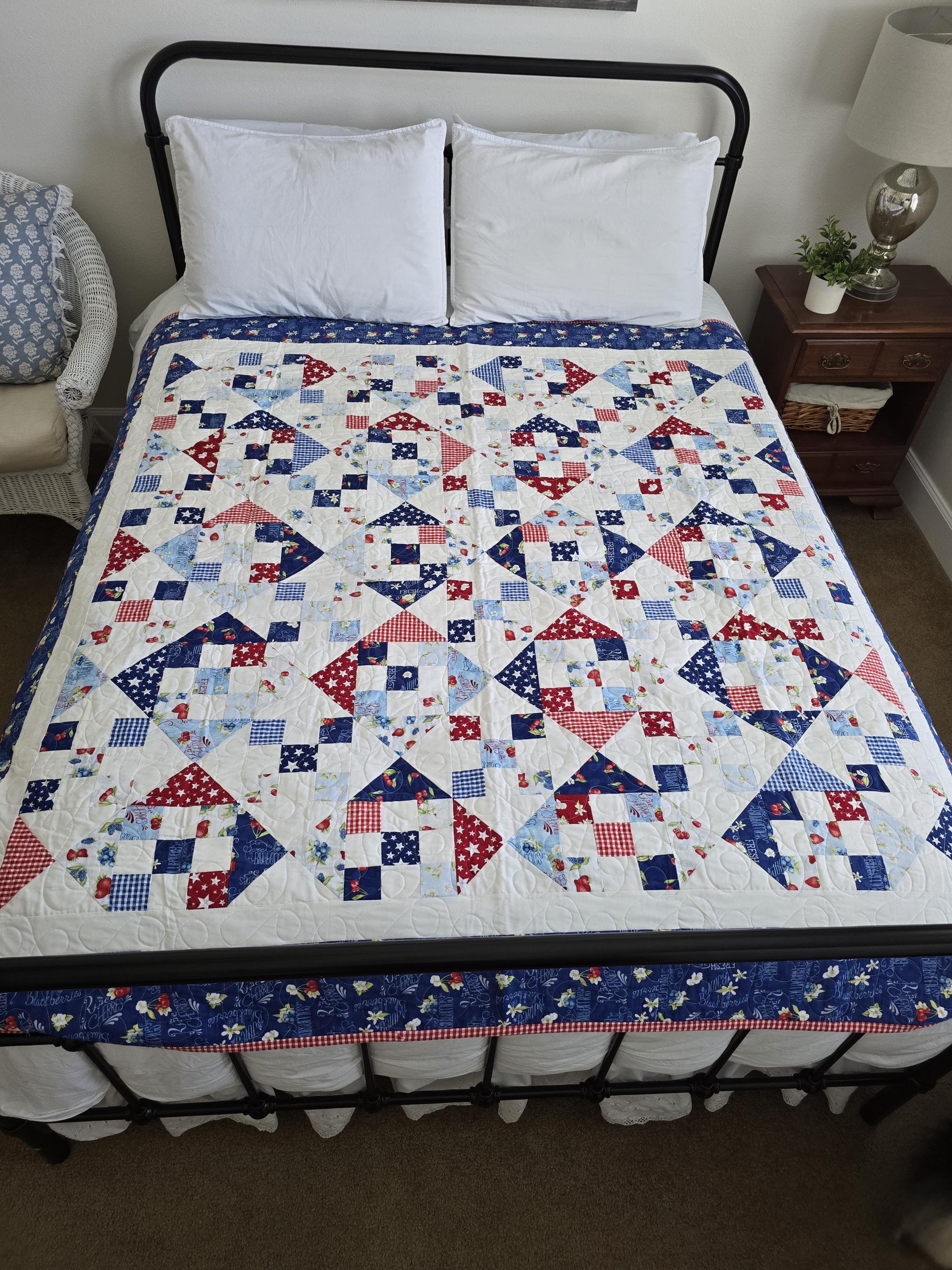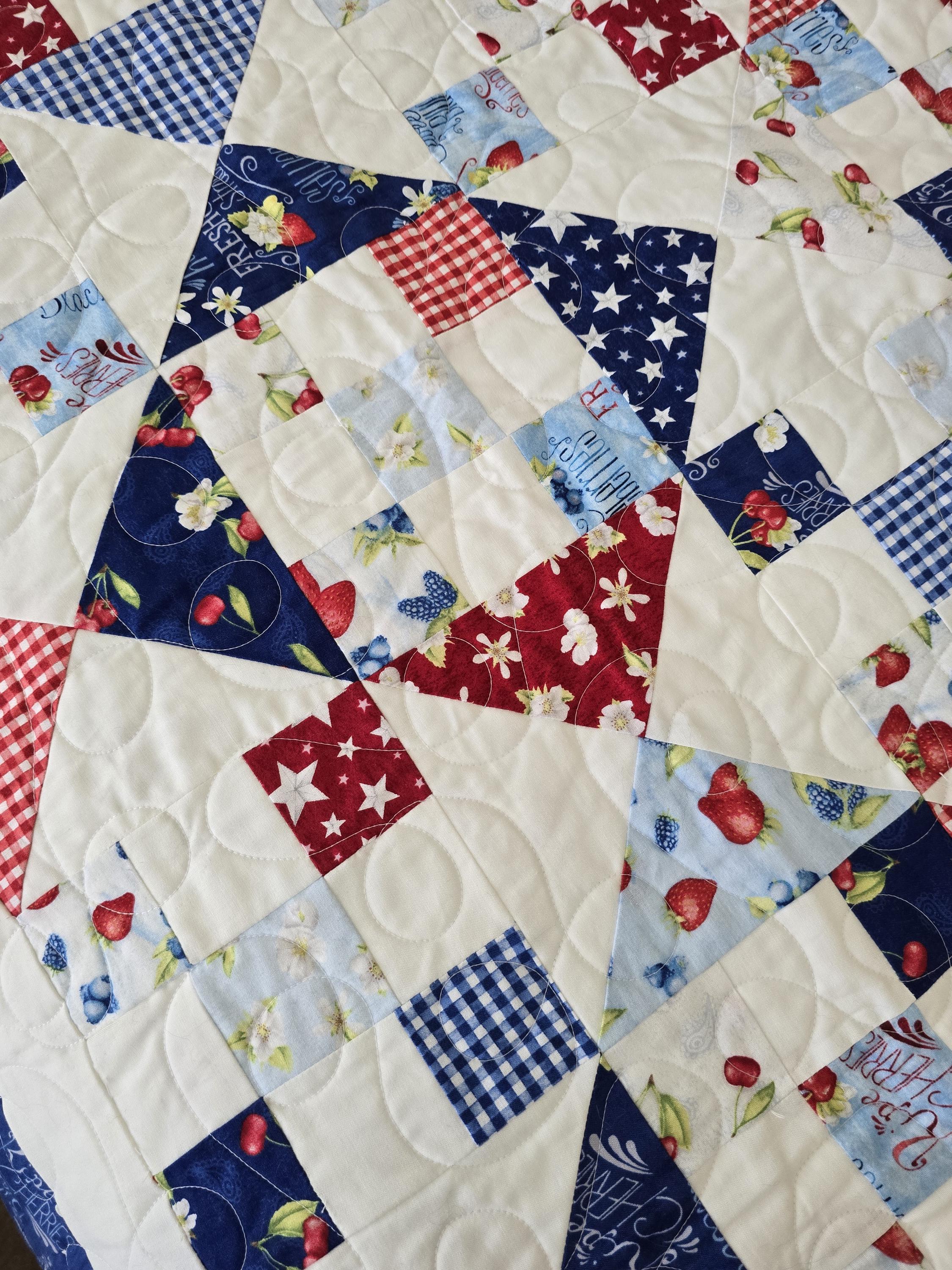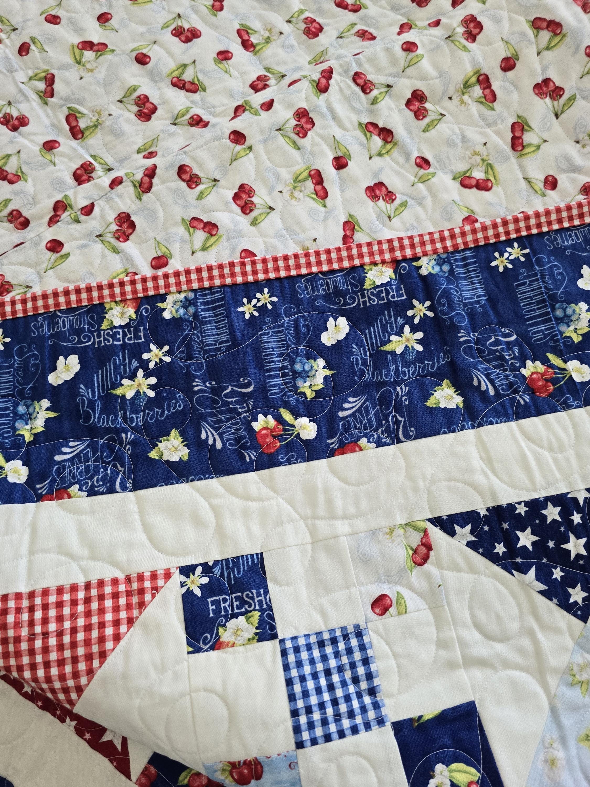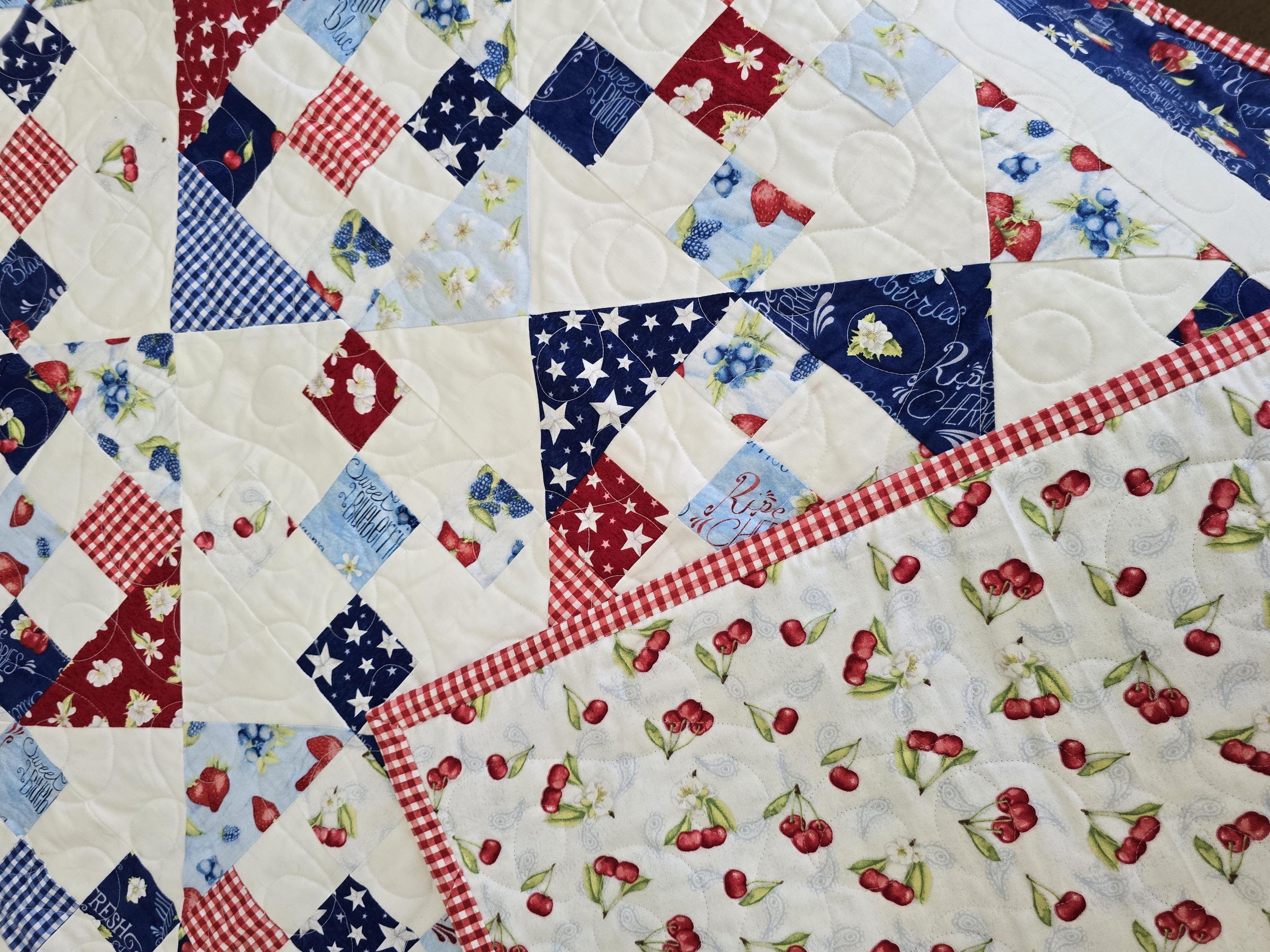 -Front and back piecing are machine stitched -Quilting is done by longarm machine with a loop design -Binding is machine stitched on the front and hand stitched on the back -All fabric is 100% cotton with a 80/20 cotton to polyester batting